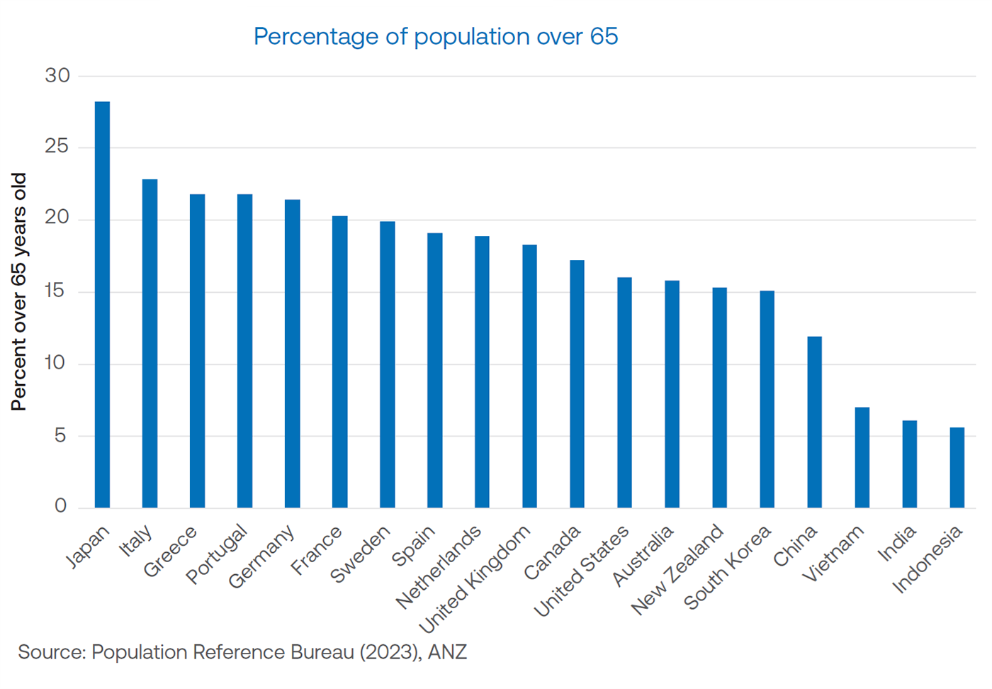 Populations are ageing across most developed markets. In Australia, around 23 per cent of people are 60 plus, and a little over one in six are 65 plus, while about 18 per cent are under 15 - a clear shift in the centre of gravity.